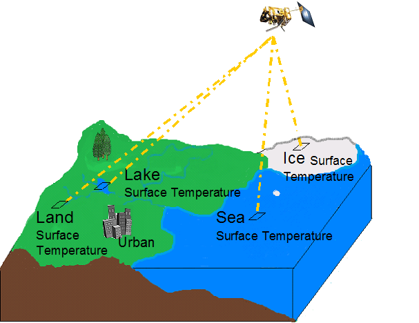 Although our focus here is on radiometric temperature, it should be noted that radiometric surface temperature signatures will vary according to the surface and its features. Land surface temperatures of different domains such as ice, sea and land are retrieved from remote sensing by applying different methods and algorithms. In this module we are focusing on one of these domains, the land.