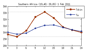 Fig. 29: Diurnal cycles of modelled skin temperature (Tskin) and 2 m air temperature (Tair) for a site in South Africa, February 2011.