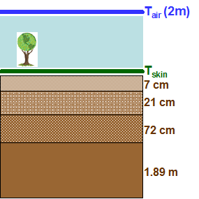 In very dry areas with no vegetation microwave radiation penetrates much deeper in the surface, on the order of cm's (Ulaby et al., 1986). Figure 28 highlights how temperatures measured at distinct soil depths can differ (different curves correspond to soil temperatures measured at various depths (7 cm, 21 cm, 72 cm and 1.89 m)). Moreover, comparing this figure with the modelled diurnal cycles of Tskin and Tair for the same date and location (Figure 29), differences in the amplitudes and phases of these variables are clear: Tskin shows the highest thermal amplitude, followed by Tsoil at the first soil level and Tair.