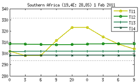 Fig. 28: Diurnal cycles of surface temperature measured at several soil layers (7 cm, 21 cm, 72 cm and 1.89 m) for a site at South Africa, February 2011.