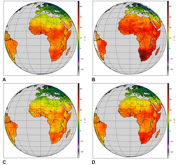 The following group of images comprises monthly mean temperature maps for December 2015 at 12:00 UTC with the following variables: