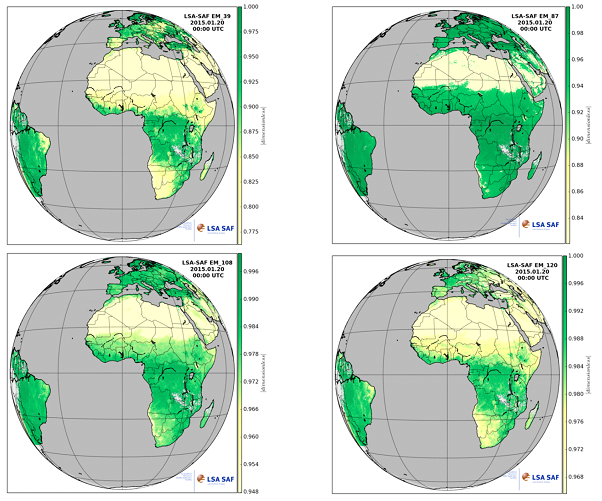 Fig. 13: Example of emissivity maps as computed by the LSA SAF SA SAF for SEVIRI channels 3.9, 8.7, 10.8 and 12.0 μm. The method uses the Vegetation Cover Method which considers the effective emissivity of each pixel as a weighted fraction of vegetation and bare ground components: εi = εivegFVC + εiground(1 - FVC). FVC is the Fraction of Vegetation Cover, a product also computed in the LSA SAF.