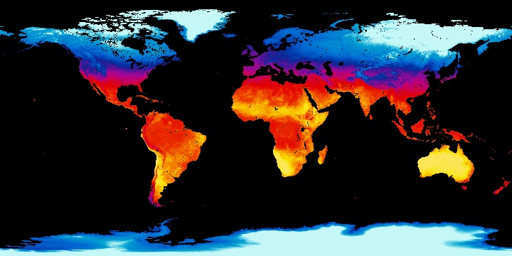 Fig. 31: Average monthly daytime land surface temperatures for December 2001 from MODIS. Source: http://neo.sci.gsfc.nasa.gov/view.php?datasetId=MOD_LSTD_CLIM_M
