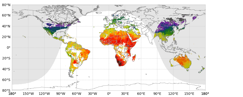 Spatial coverage: Low orbit derived products have global coverage whereas LST from SEVRI is limited to the MSG disk area.
