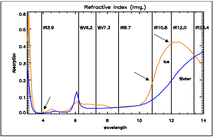 For semi-transparent clouds the brightness temperature difference of two channels depends strongly on differences in transmissivity. The transparency of thin ice clouds is considerably different around 3.74, 10.8 and 12.0 micrometers, as the ice's absorption is rather different at these wavelengths (see the arrows in Fig. 1a). Thin cirrus clouds can be detected by the (IR12.0-IR10.8) and (IR10.8-IR3.74) differences (large negative differences). The absorption is weaker in the IR10.8 channel than in the IR12.0 channel, which means the IR10.8 transmissivity will be higher and as a consequence the (IR12.0-IR10.8) brightness temperature difference will be negative.
