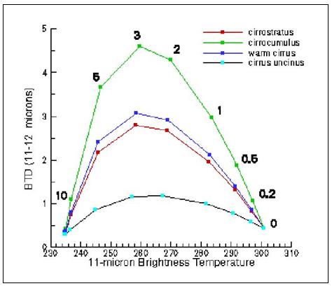 Fig. 1b shows simulated (11-12 microns) brightness temperature difference (BTD) values as a function of 11 micron brightness temperature (BT) for different types of cirrus clouds. The black numbers along the curves refer to the cloud optical thickness. The figure shows that: