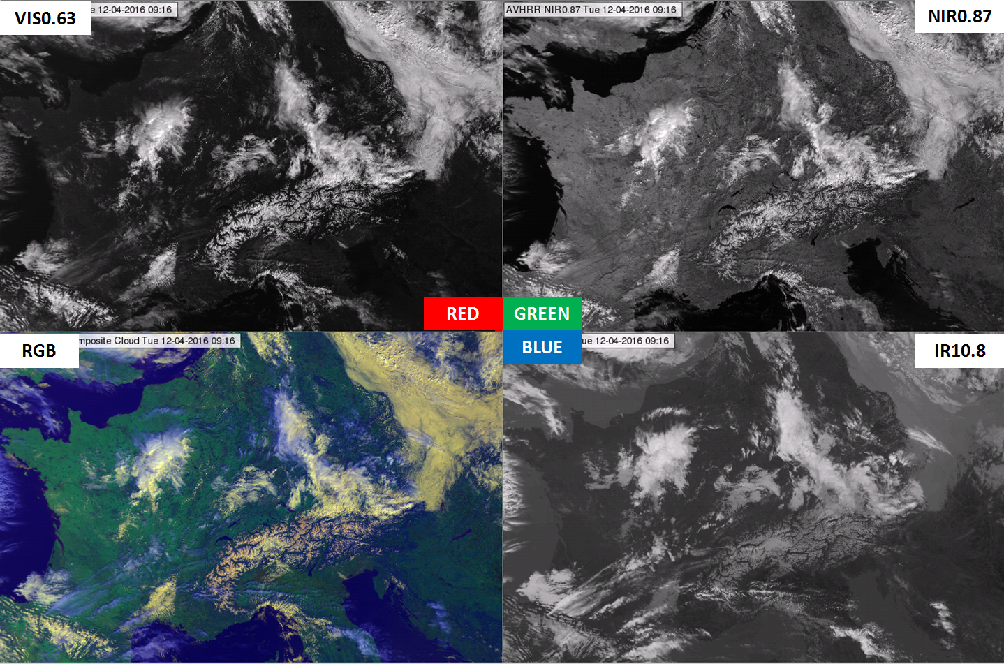 Figure 2c: 4-Panel display, please use your mouse to compare the four images. METOP-A AVHRR VIS0.63, NIR0.87, Cloud RGB and IR10.8 images on 12 April 2016 at 09:16 UTC