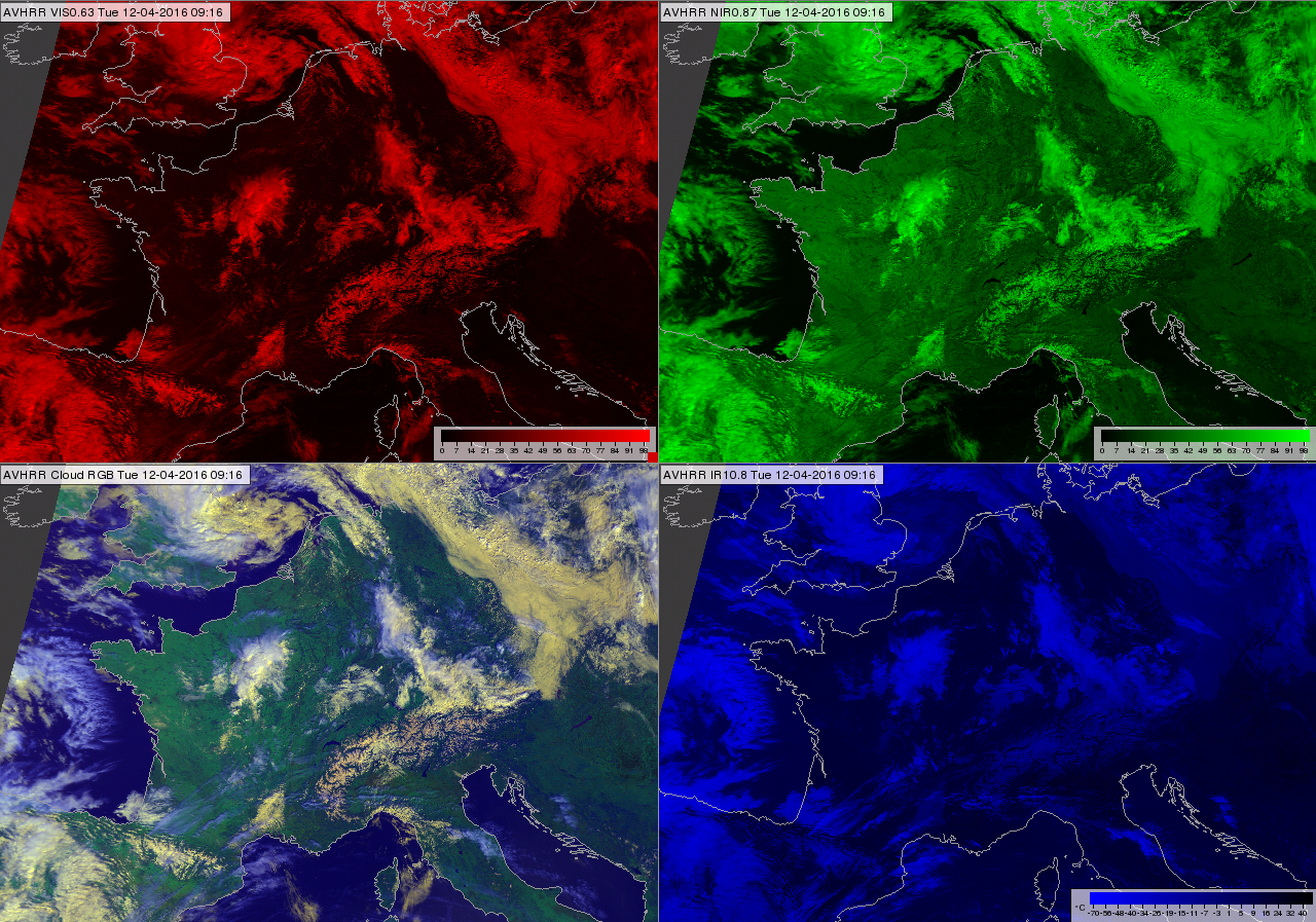 Figure 2b: METOP-A AVHRR VIS0.63 (upper left), NIR0.87 (upper right), Cloud RGB (bottom left) and IR10.8 (bottom right) images on 12 April 2016 at 09:16 UTC