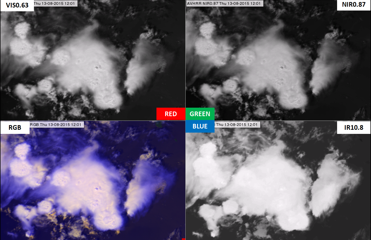 Figure 3: AVHRR VIS0.63 (upper left), NIR0.87 (upper right), Cloud RGB (bottom left) and IR10.8 (bottom right) images on 13 August 2015 at 12:01 UTC