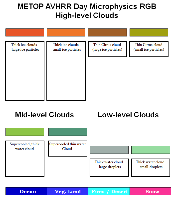 The main purpose of this RGB type is to provide complex cloud analysis with good color contrast between cloud types and against the surface.