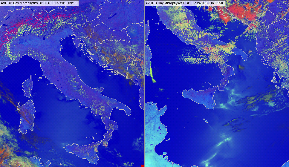 Fig. 9b shows high-level lee clouds south and southwest of the Alps. They appear bright green in the AVHRR Day Microphysics RGB image (upper panel) because they consist of extremely small ice crystals. A SEVIRI Day Microphysics RGB is shown in the bottom panel for comparison. (This link shows what such cirrus cloud with small ice crystals looks like from the ground.)