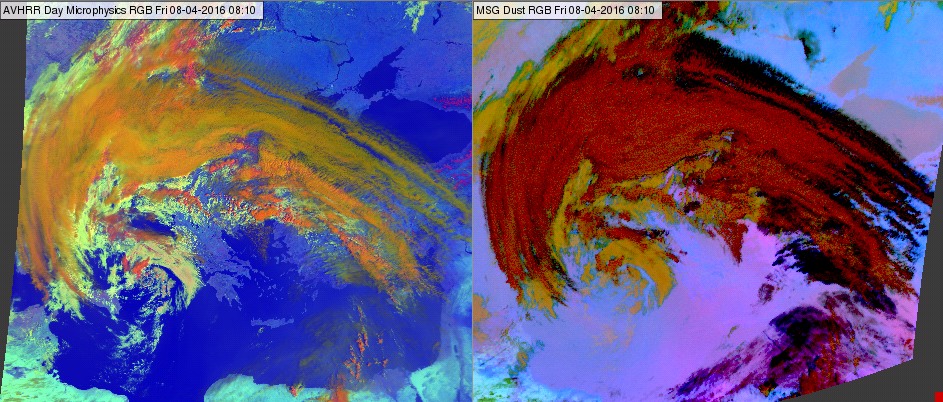 Figure 9a: METOP-B AVHRR Day Microphysics RGB (left) and MSG SEVIRI Dust RGB (right) images of the Mediterranean Sea region on 8 April 2016 at 08:10 UTC