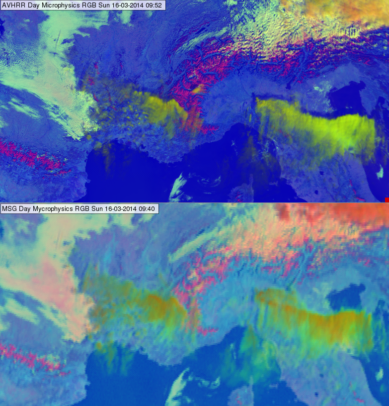 Figure 9b: AVHRR Day Microphysics RGB (top) and SEVIRI Day Microphysics RGB (bottom) images of the Alps region on 16 March 2014 at 09:52 and 09:40 UTC