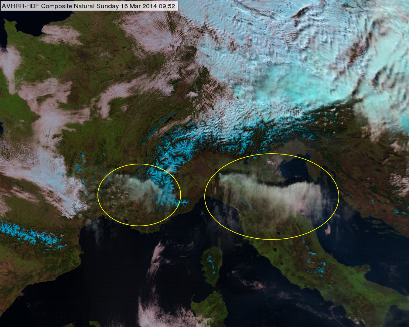 Figure 9: AVHRR, Natural Colour RGB image of the Alps on 16 March 2014 at 09:52 UTC
