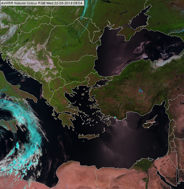 Figure 10: Sunglint over the Mediterranean and the Black Sea in the AVHRR Natural Colour RGB image on 22 June 2016 at 08:04 UTC