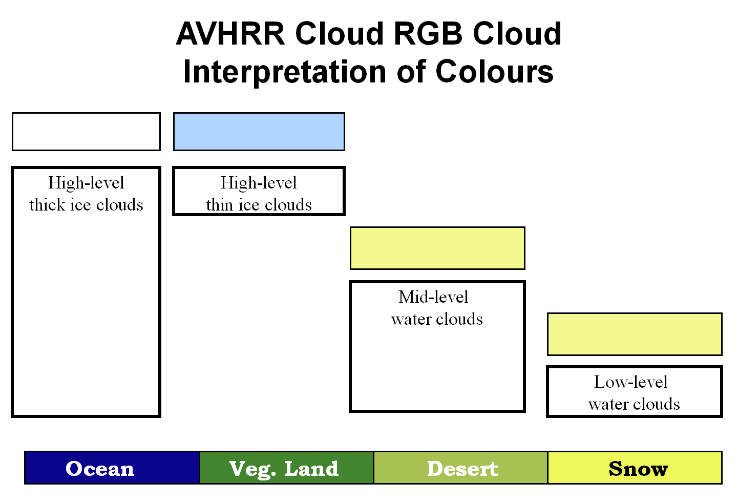 Fig. 4 shows the typical colors of Cloud RGB images. These are just examples, and many other colors and tones are possible. Note that the brightness and shades of the colors may vary across the swath. For more on this, see the chapter 'Effects of the scanning geometry'.