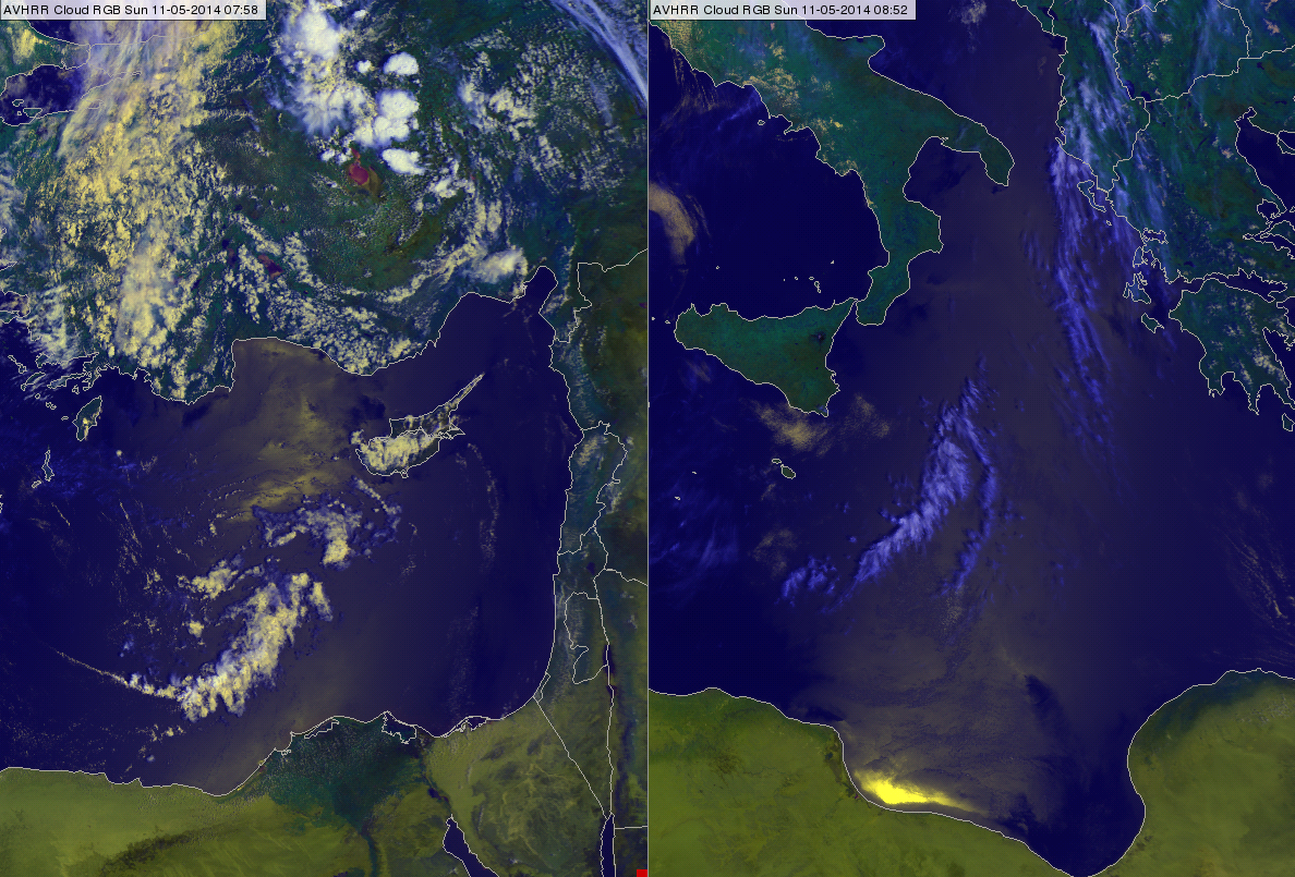 Figure 5: Sunglint over the Mediterranean Sea in AVHRR Cloud RGB images on 11 May 2014 at 07:58 (left) and 08:52 UTC (right)