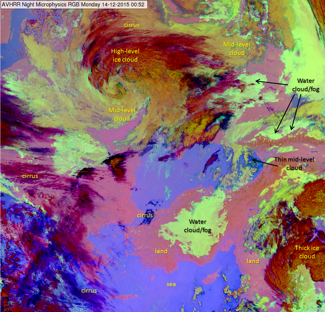 Figure 10: AVHRR Night Microphysics RGB on 14 December 2015 at 00:52 UTC