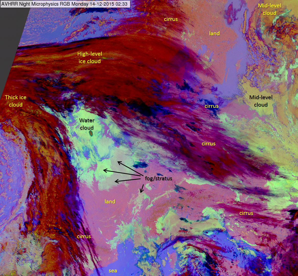 Figure 11: AVHRR Night Microphysics RGB on 14 December 2015 at 02:33 UTC