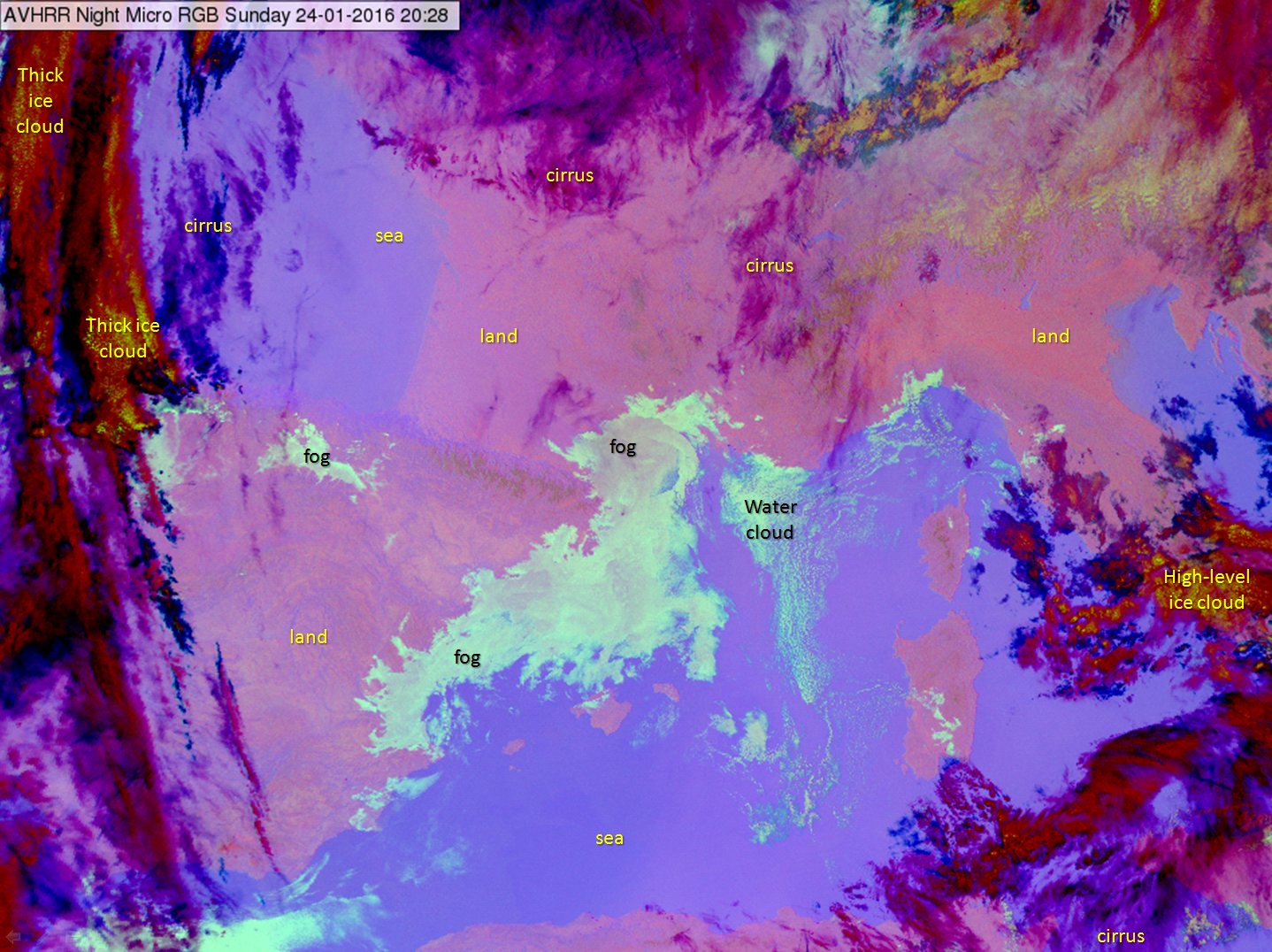 Figure 12: AVHRR Night Microphysics RGB on 24 January 2016 at 20:28 UTC