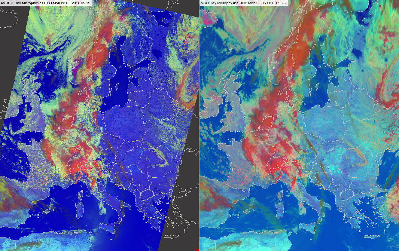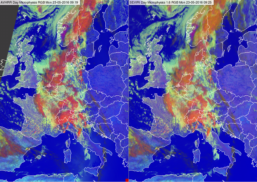 Figure 13: METOP-B AVHRR Day Microphysics RGB (left) and Meteosat SEVIRI RGB created with the same recipe and using the SEVIRI NIR1.6 channel as the green component (right). The images are from 23 May 2016 at 09:19 and 09:25 UTC