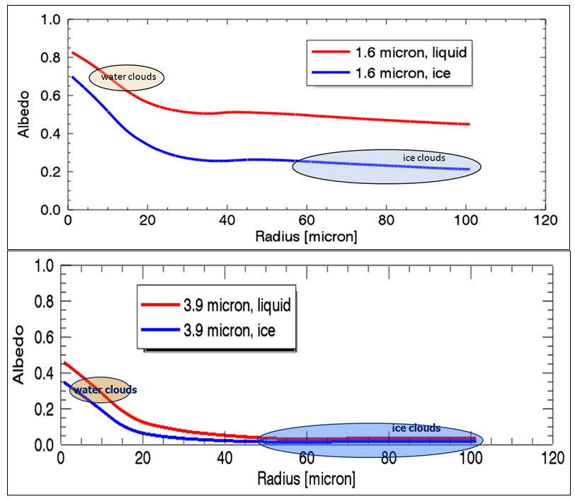 Figure 14: Simulated albedo of water and ice clouds (red and blue curves) at 1.6 (top) and 3.9 (bottom) micrometer wavelengths as a function of effective particle size. The ellipses represent the typical range of water droplet and ice particle sizes.