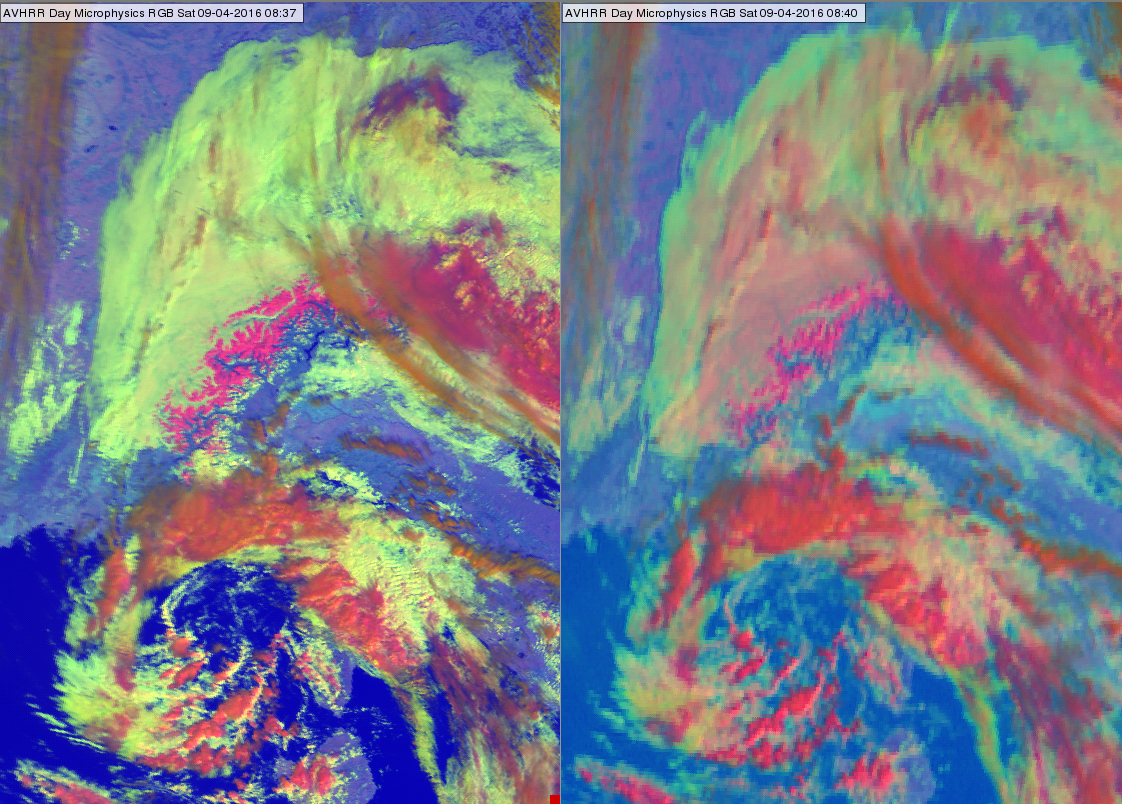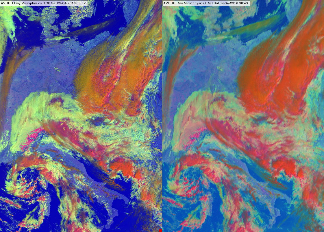 In the following examples the AVHRR Day Microphysics RGB will be compared with the standard SEVIRI Day Microphysics RGB. They use different channels for their green components. The solar component of IR3.9 data is used in the standard SEVIRI Day Microphysics RGB as it is more sensitive to cloud top effective particle size than the NIR1.6 channel. However, for AVHRR only the NIR1.61 channel is available during the day.