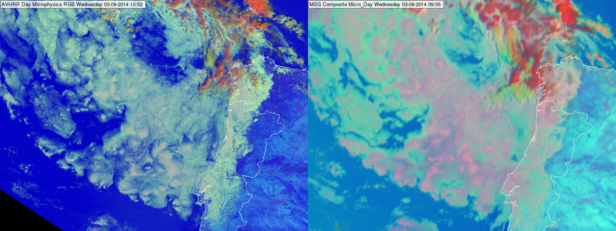 Figure 17: AVHRR Day Microphysics RGB (left) and SEVIRI Day Microphysics RGB (right) images on 3 September 2014 at 10:52 and 09:55 UTC