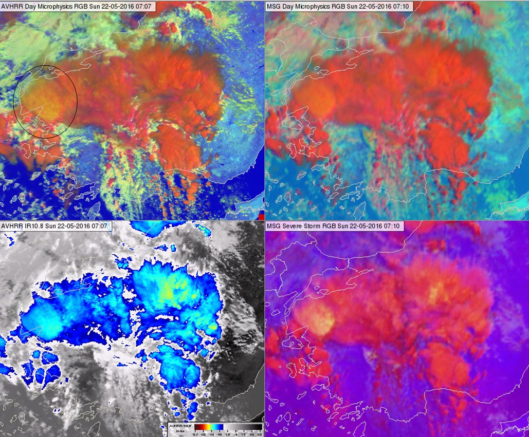 Figure 18: AVHRR Day Microphysics RGB (upper left), SEVIRI Day Microphysics RGB (upper right), AVHRR IR10.8 color enhanced (bottom left) and SEVIRI Severe Storm RGB (bottom right) images over Turkey on 22 May 2016 at 07:07 and 07:10 UTC