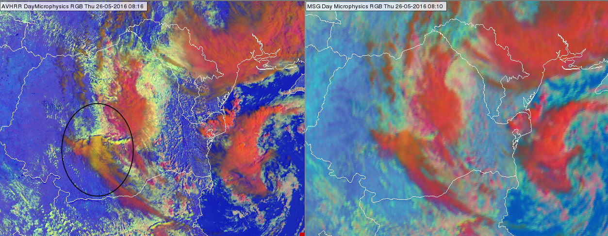 Figure 19: METOP-B AVHRR Day Microphysics RGB (left) and MSG SEVIRI Day Microphysics RGB (right) images on 26 May 2016 at 08:16 and 08:10 UTC