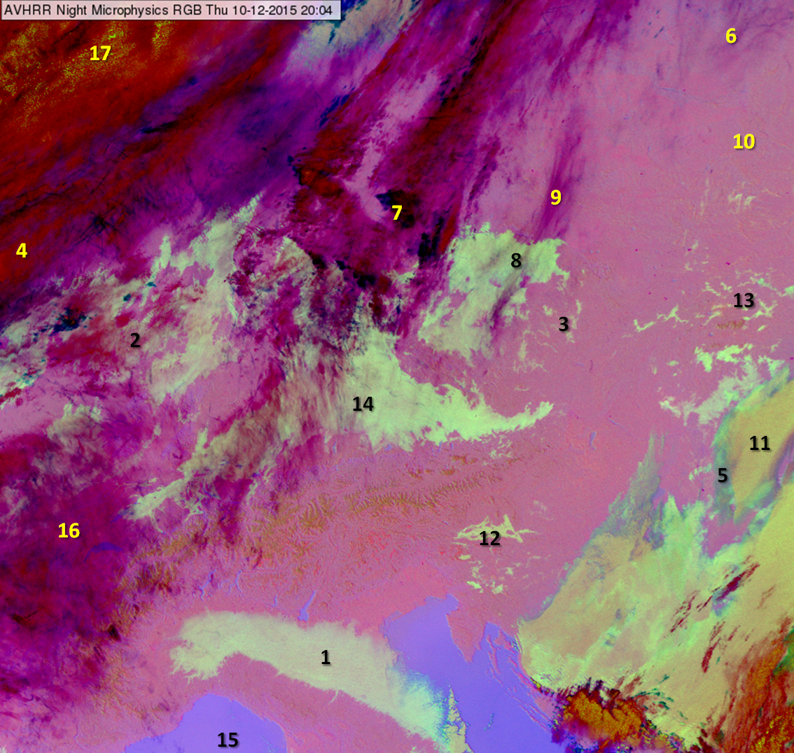 Figure 15: AVHRR Night Microphysics RGB image on 10 December 2015 at 20:04 UTC