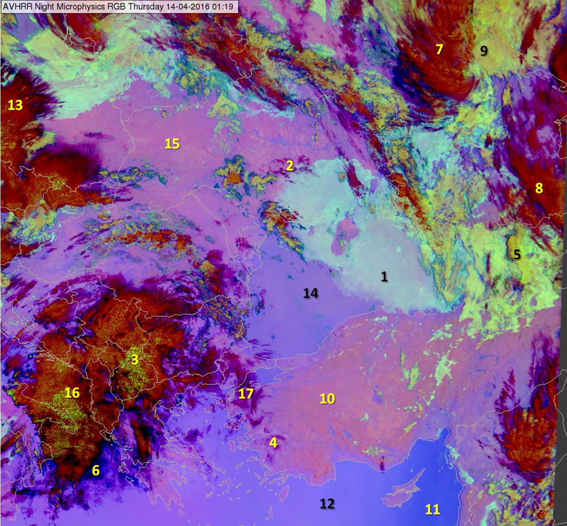 Figure 15: NOAA-19 AVHRR Night Microphysics RGB on 14 April 2016 at 01:19 UTC