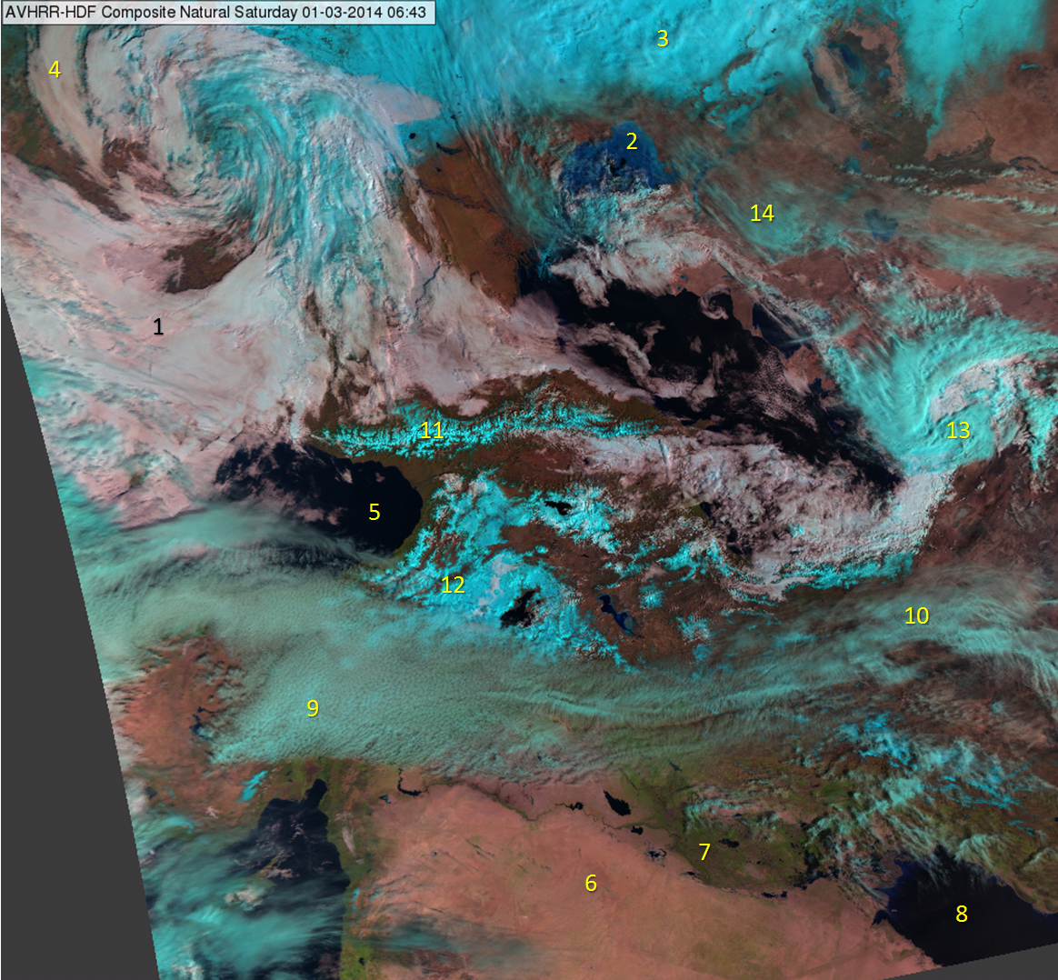 Figure 15: AVHRR Natural Colour RGB image of the Caspian Sea region on 1 March 2014 at 06:43 UTC