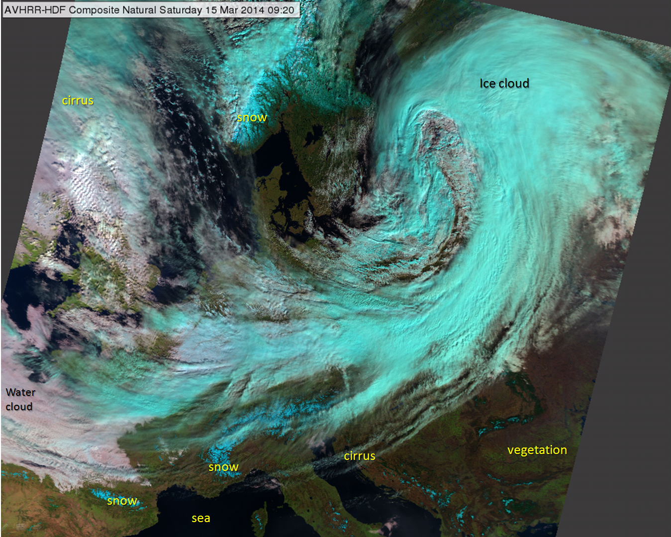 Figure 12: AVHRR Natural Colour RGB image on 15 March 2014 at 09:20 UTC