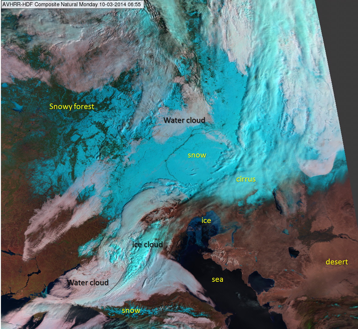 There are good color contrasts between snow and land and between snow and water clouds. Unfortunately snow and thick ice clouds have similar colors, with slight differences. Their structure and the movement observed in consecutive images can help tell the difference.