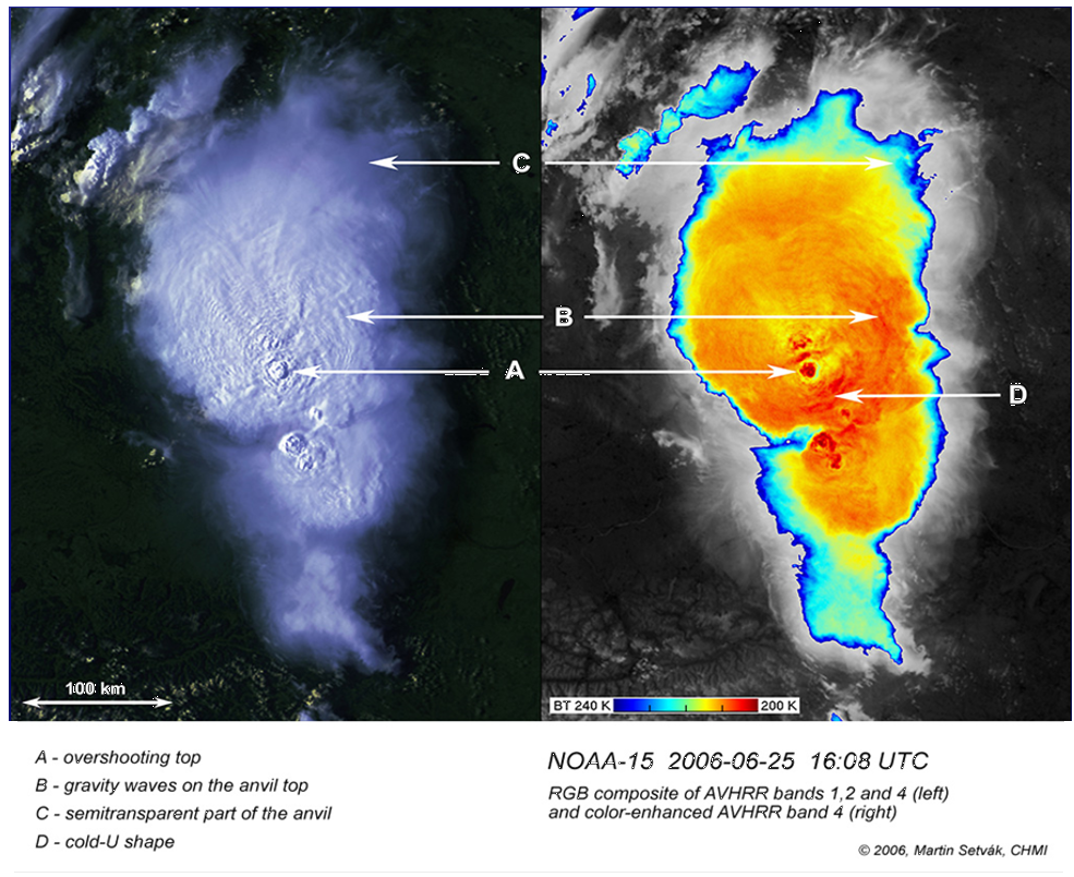 Figure 4.1: Cloud top features shown in the RGB composite of AVHRR band 1, 2 and 4 (left) and in the AVHRR band 4 IR image (right) of NOAA-15 satellite, taken on 25 June 2006 at 16:08 UTC, Czech Republic. (Courtesy of Martin Setvák, CHMI)