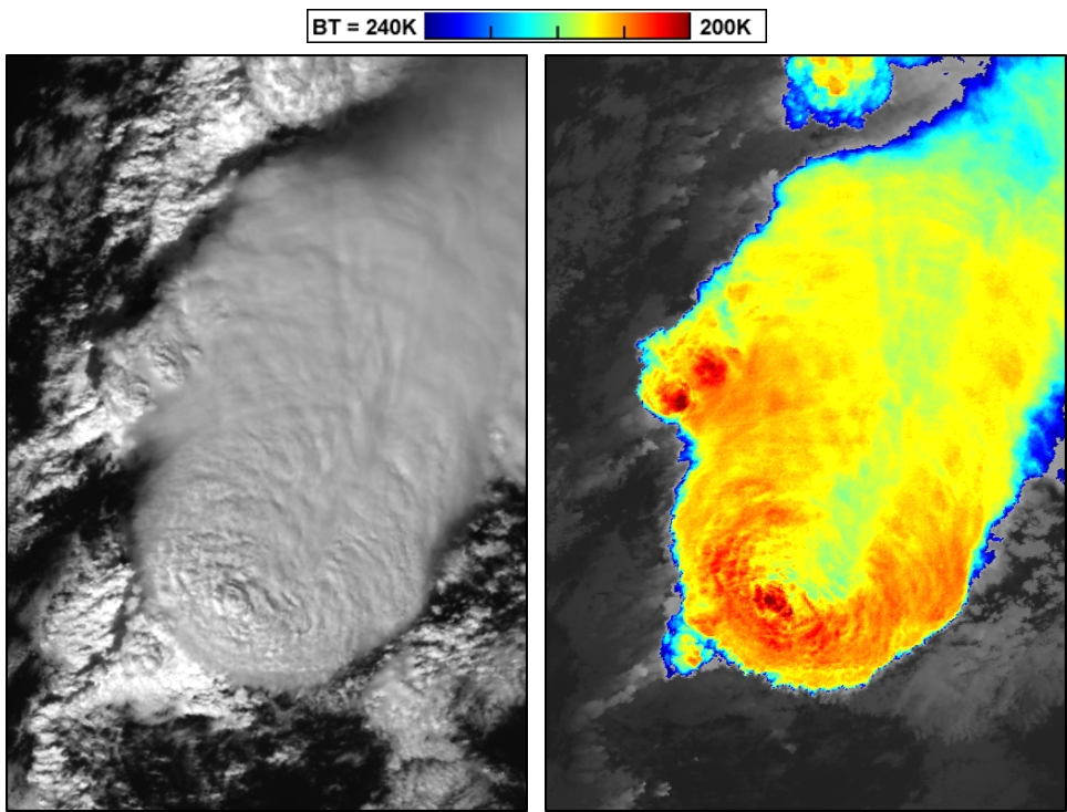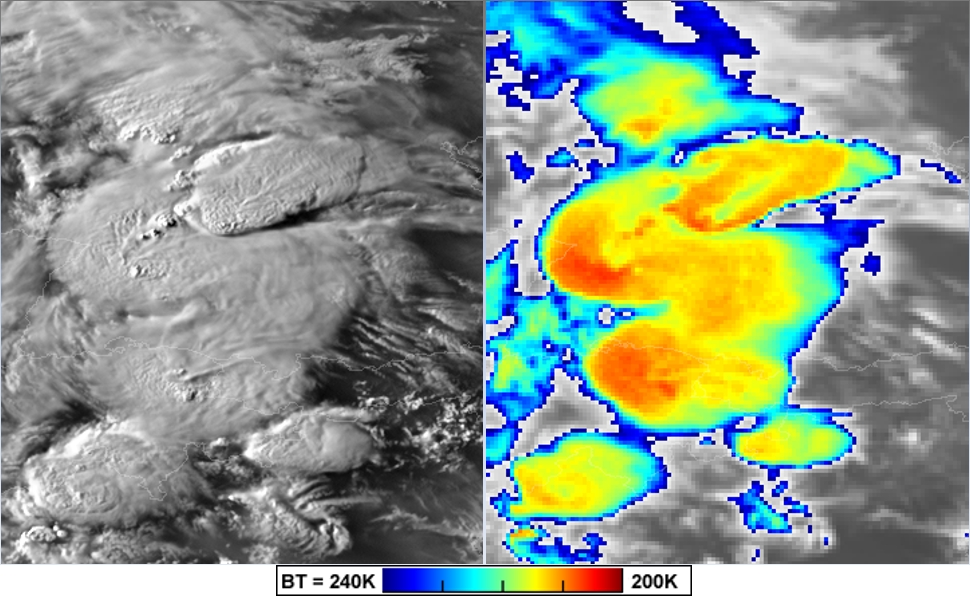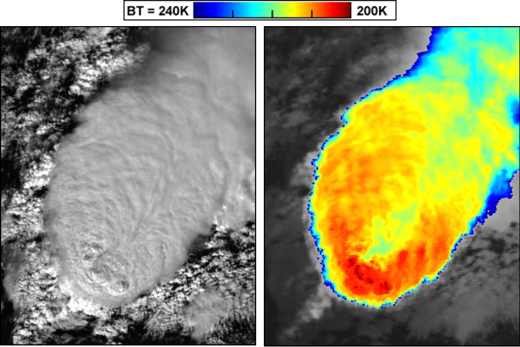 The next two figures (Figs. 4.2 and 4.3) show visible and IR window image pairs of the same storm, observed by two polar satellites, with a 21 minutes time shift between them. In the MODIS image (Fig 4.2) several OTs are seen, while in the VIIRS image (Fig 4.3) one OT is seen and there is a 'corresponding' local BT minimum in the IR image.