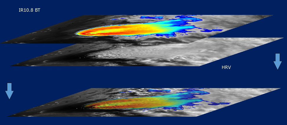 Figs. 5.4 and 5.6 show storms with very complex cloud top structures: overshooting tops, cold ring or cold-U shape, above anvil ice plumes, and anvil-top waves. One can see how more informative the sandwich product is than the HRV or the IR10.8 separately!