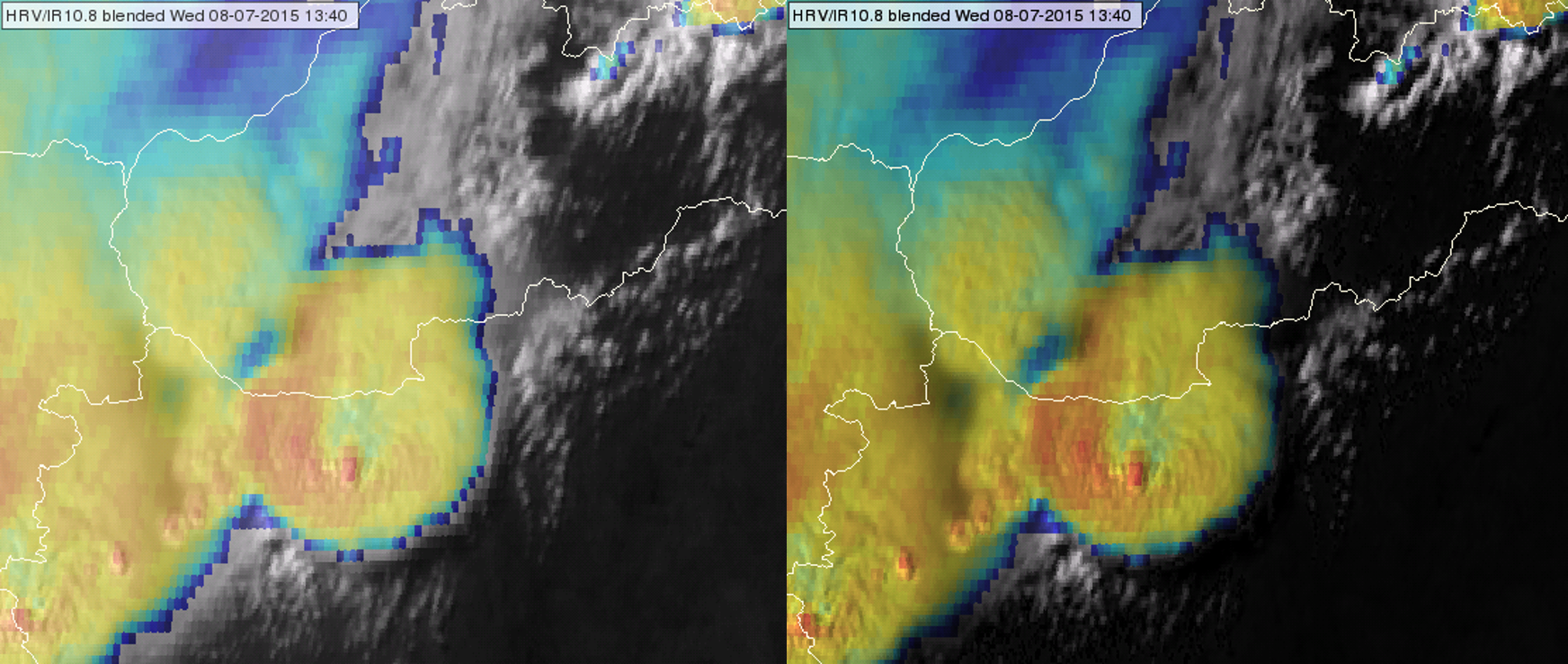 Figure 5.2: SEVIRI HRV/IR10.8 blended image processed without (left) and with (right) the ImageMagick script, taken on 8 July 2015 at 13:40 UTC