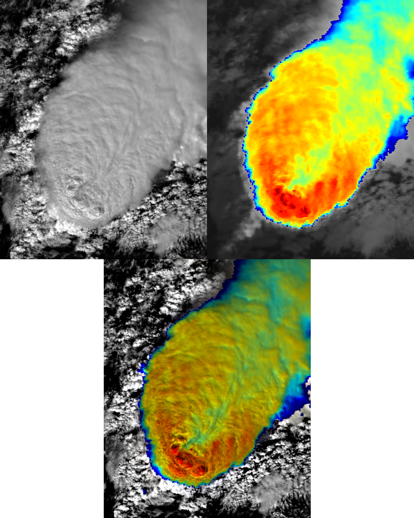 Figure 5.3: Overshooting tops, cold-U and above-anvil ice plumes in the form of 'ship waves' in MODIS 250m band 01 image (upper left), 1 km colour-enhanced band 31 image (upper right) and band01/band31 blended image (bottom), taken on 16 September 2016 at 12:22 UTC over Tyrrhenian Sea and Italy. (Courtesy of Martin Setvák, CHMI)