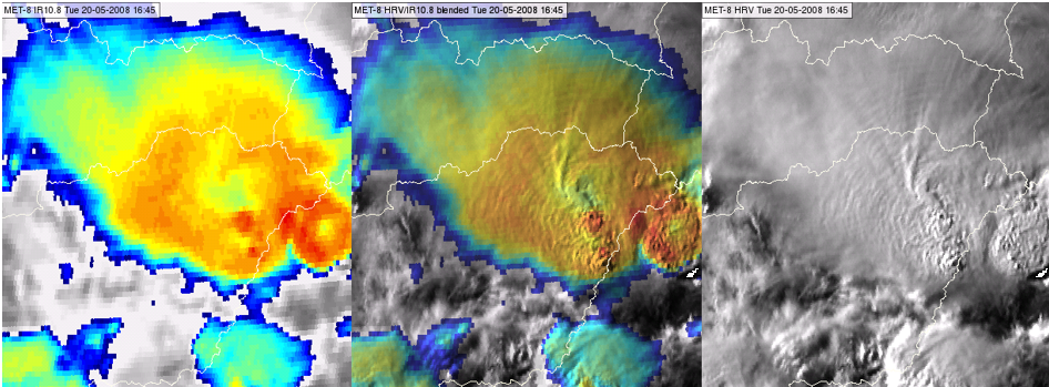 Figure 5.6: Meteosat SEVIRI IR10.8 (left), HRV/IR10.8 blended (middle) and HRV (right) images, taken on 20 May 2008 at 16:45 UTC of a tornadic storm over Hungary. (Processed at OMSZ with the ImageMagick script using 200-240 K BT region for the colour enhancement.)