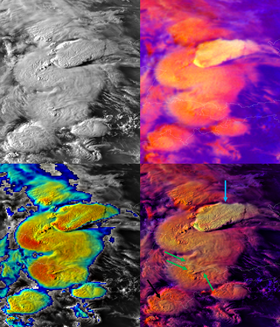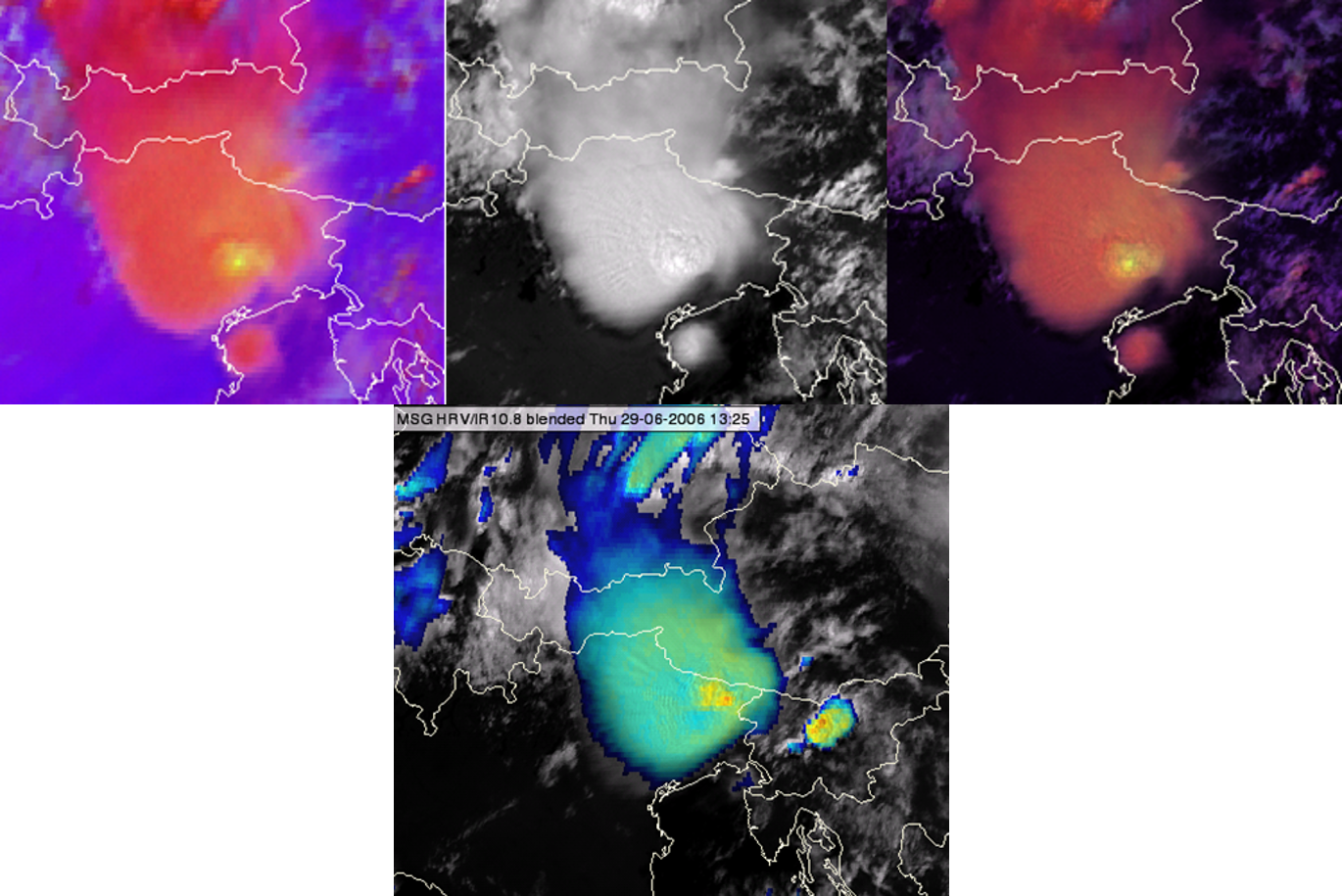 Figure 6.2a: Severe Storms RGB (upper left), HRV (upper middle), HRV/Severe Storms RGB blended image (upper right) and HRV/IR10.8 blended image (bottom), taken on 29 June 2006 at 12:25 UTC. (Processed at OMSZ with the ImageMagick script.)