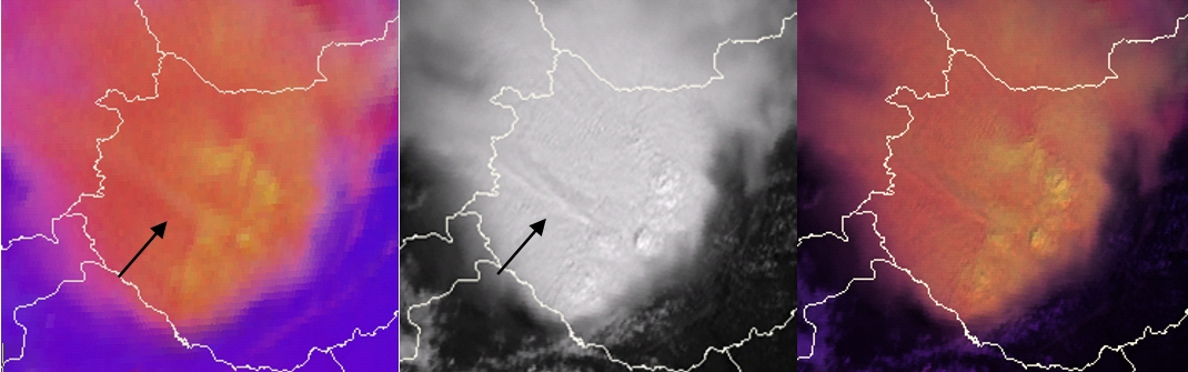 Figure 6.2b: Severe Storms RGB (left), HRV (middle), HRV/Severe Storms RGB blended image (right), taken on 29 June 2006 at 10:10 UTC over Hungary. (Processed at OMSZ with the ImageMagick script.)