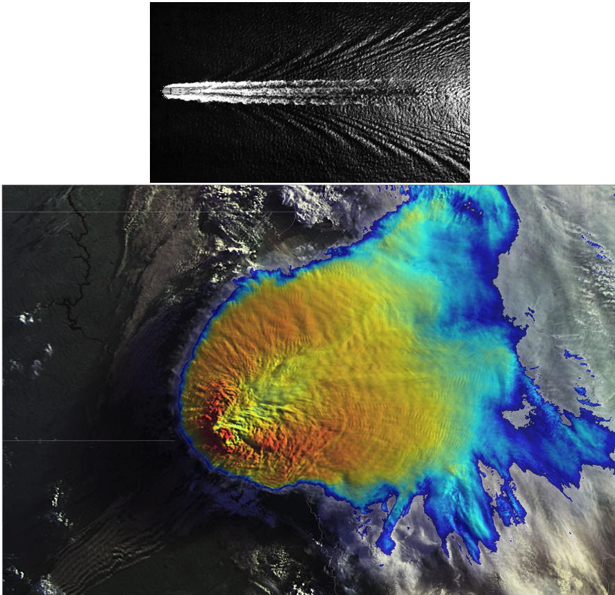 Figure 7.12: 'Ship trail gravity waves' behind a ship (top image) and downstream of the overshooting top of a storm above South Dakota (USA) in a NOAA-15 AVHRR blended image (below), taken on 9 July 2009 at 11:35 UTC. (The satellite image is processed by Martin Setvák, CHMI)