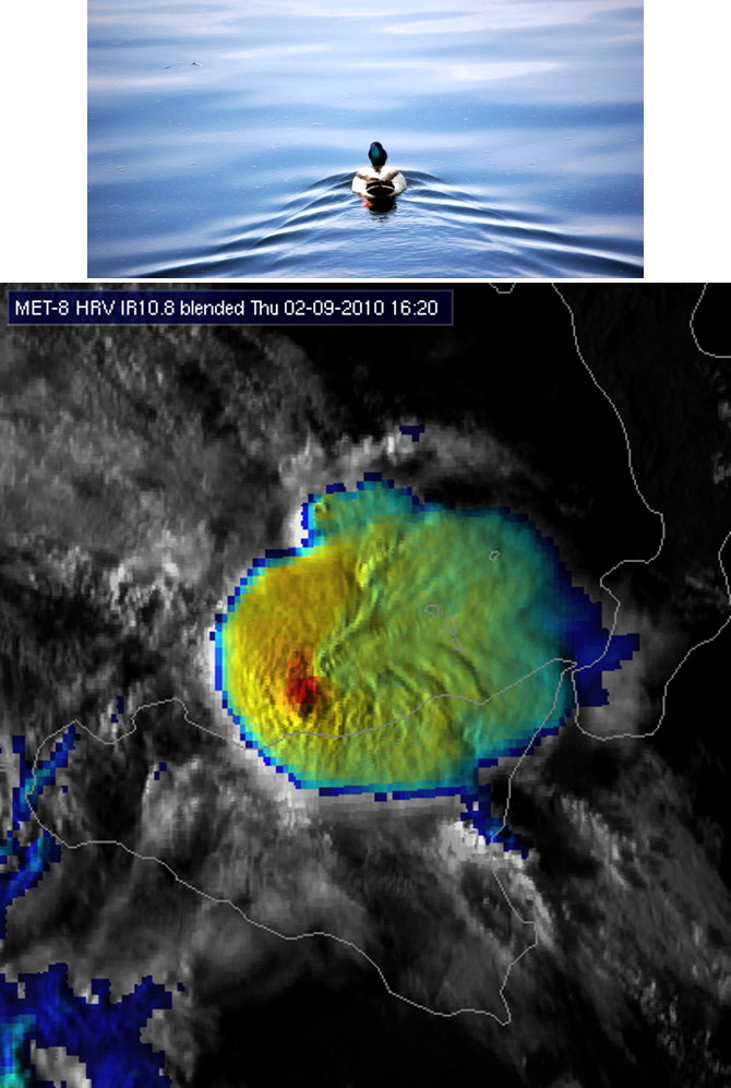 Figure 7.13: 'Ship trail gravity waves' behind a duck (top image) and downstream of the overshooting top over the coast of Sicily in a Meteosat SEVIRI HRV/IR10.8 blended image (bottom), taken on 2 September 2010 at 16:20 UTC. (Processed at OMSZ with the ImageMagick script using the 200-240 K BT region for the colour enhancement.)