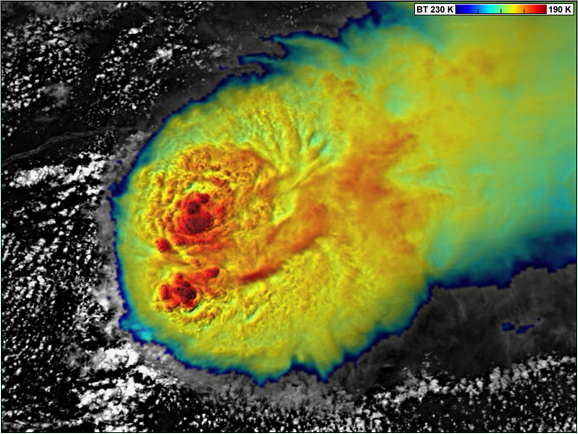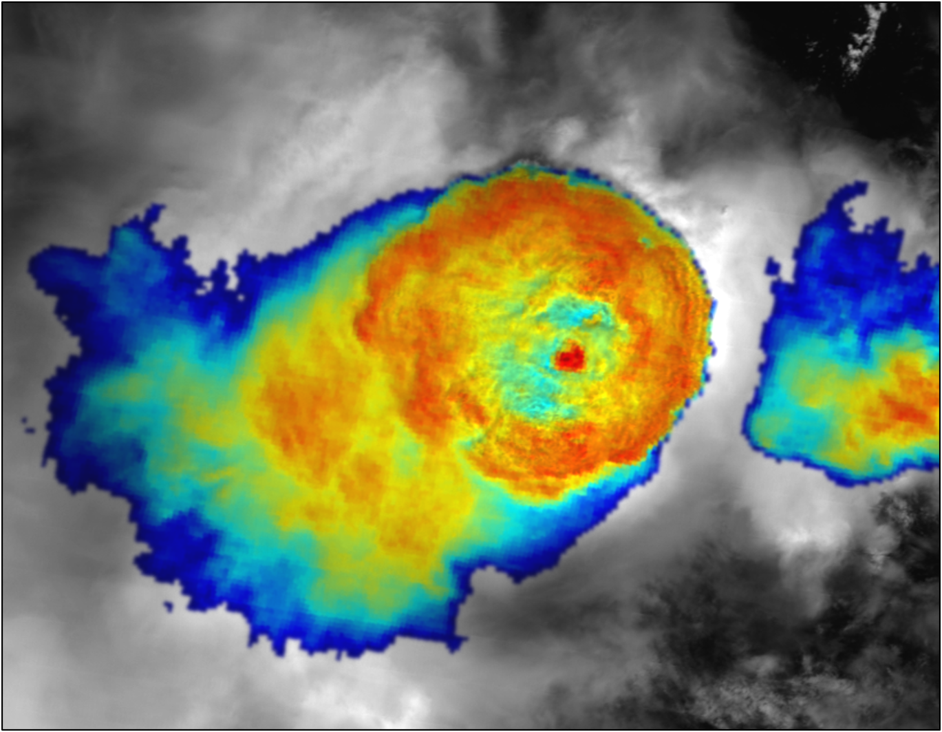 Figure 7.2: Storm with cold ring and overshooting top in centre of the cold ring east of Vietnam coast, Terra MODIS image, taken on 28 October 2016 at 03:10 UTC. Sandwich product created from band 01 and colour-enhanced band 31 (BT 183-203K). (Courtesy of Martin Setvák, CHMI)