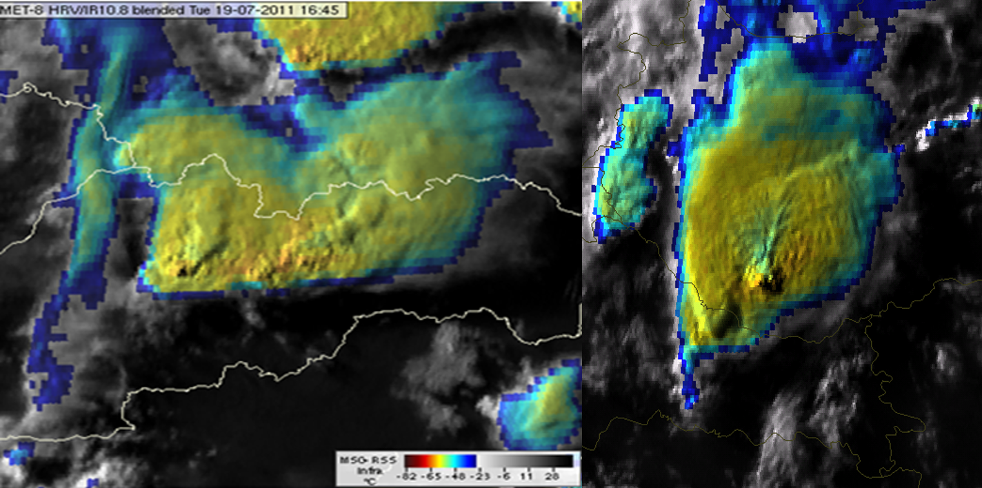 Figure 7.5: Above-anvil ice plumes in Meteosat SEVIRI HRV/IR10.8 blended image over Slovakia, taken on 19 July 2011 at 16:45 UTC (left), and over Hungary, taken on 9 June 2012 at 17:33 UTC. (Processed at OMSZ with the ImageMagick script using 200-240 K BT region for the colour enhancement.)
