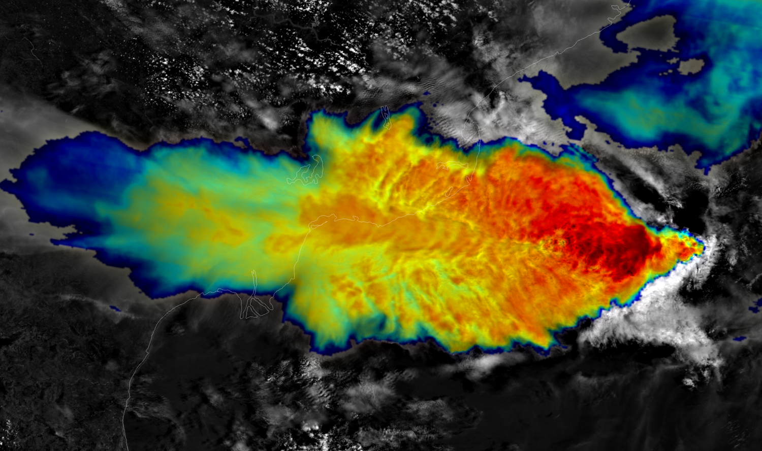 Figure 7.6: Above-anvil ice plume in Terra MODIS blended image over Gulf of Bengal, taken on 25 August 2003 at 05:20 UTC. (Courtesy of Martin Setvák, CHMI)