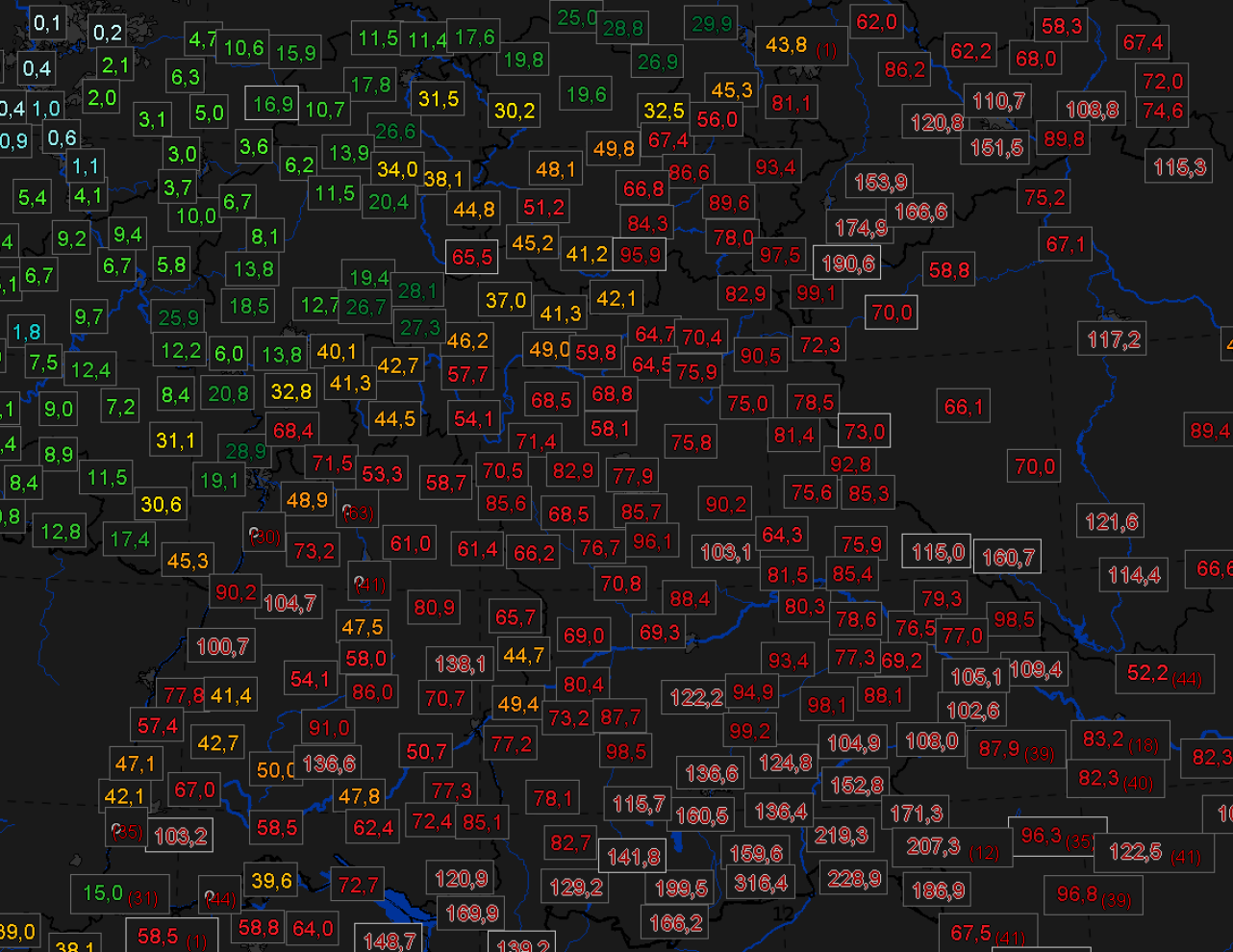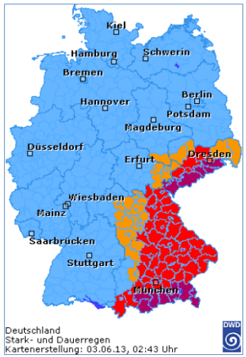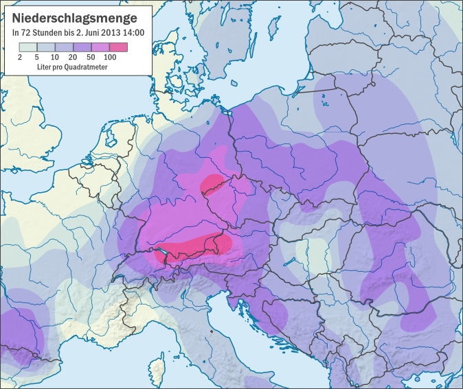 The following chart shows the center of the precipitation between 31 May and 2 June 2013 in the northeast and south of Germany and the adjacent Czech Republic and Austria. During this time precipitation reached more than 100 mm or 100 liters per square meters.