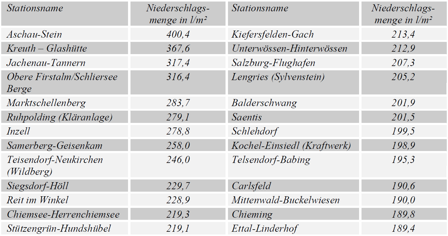 The total precipitation in Germany and adjacent countries from 31 May to 4 June 2013 is shown above in figures 1.2 and 1.3. The highest value of 400.4 mm was recorded at the Aschau-Stein station southwest of the Chiemsee.